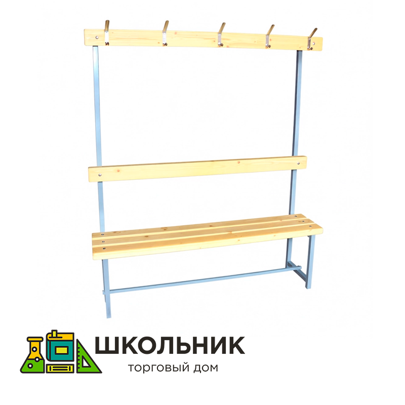 Односторонняя скамейка отлично подойдёт для оснащения раздевалок или школьных классов. Сиденье, спинка и планка для крючков изготовлены из хвойных пород дерева и покрыты лаком. Каркас сделан из металлического профиля и покрыт эпоксидной эмалью. На ножки установлены пластиковые заглушки. В комплекте — 3 крючка для одежды.