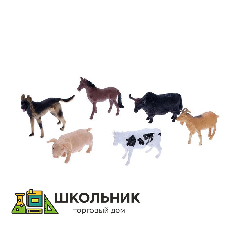 - В набор входят 6 фигурок домашних животных: собака, лошадь, бык, свинья, козёл и корова.